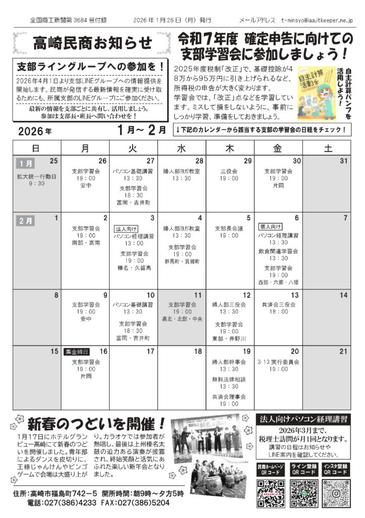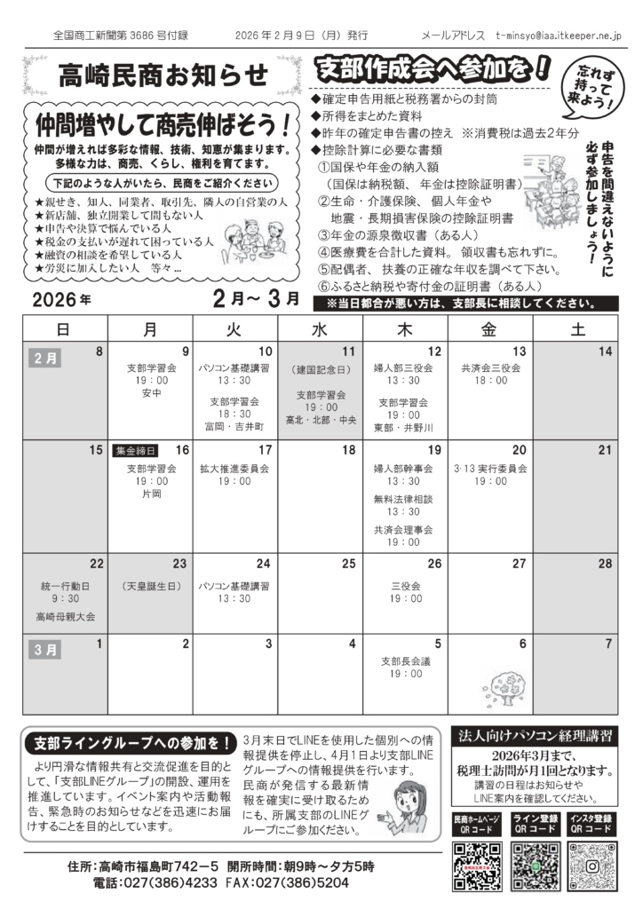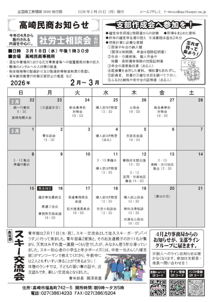 2026年2~3月の活動日程 2023.08.192026.02.202025年7月28日、高崎民商お知らせ2025年7月14日日程表ダウンロード2025年6月30日日程表ダウンロード2025年6月16日、高崎民商お知らせ2025年3月31日、高崎民商お知らせ2025年3月17日、高崎民商お知らせ2025年3月10日、高崎民商お知らせ2025年2月24日、高崎民商お知らせ2025年2月10日、高崎民商お知らせ2025年1月27日、高崎民商お知らせダウンロード2025年1月13日、高崎民商お知らせダウンロード